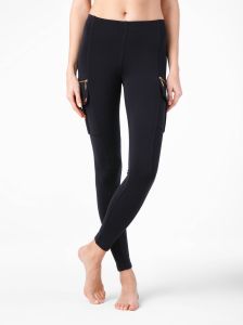 Women's tight-fitting leggings made of knitted fabric with raised seams on the front and back. On the barrels of the product there are patch pockets with a bow pleat, with flaps and decorative zippers. The top of the product is treated with a wide elastic band with a seam in the hem.