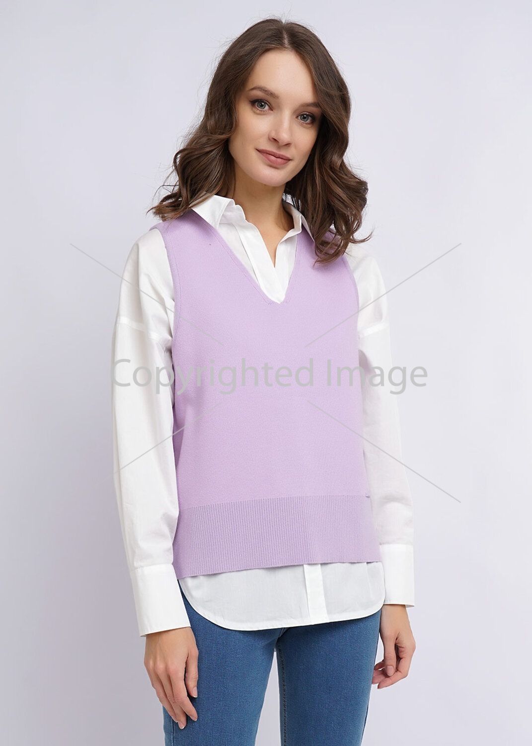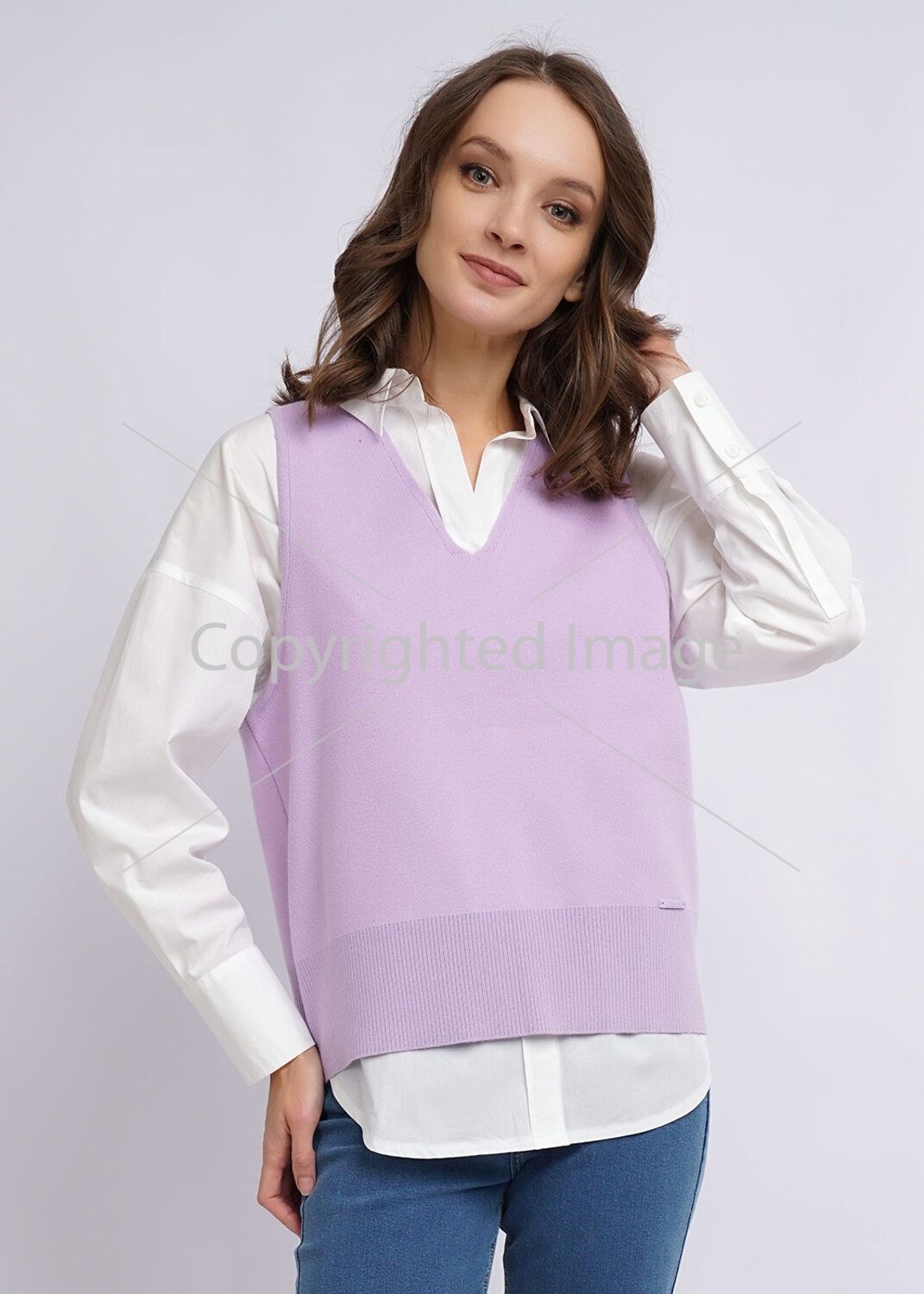 Vest made of viscose yarn. V-shaped neck. A patch completes the design.