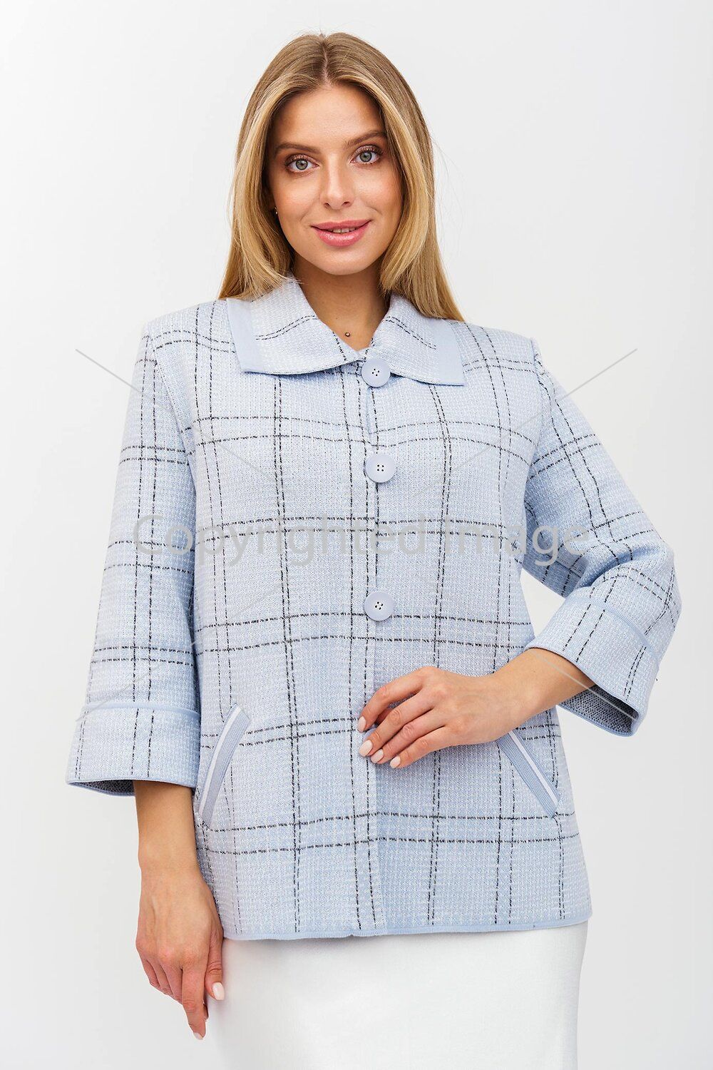 Women's knitted jacket of a loose silhouette with a shirt turn-down collar. 3/4-length set-in sleeve with lapel. There are two welt pockets on the sides. The jacket is buttoned with a hinged loop. The product is made of jacquard weave forming a cage.