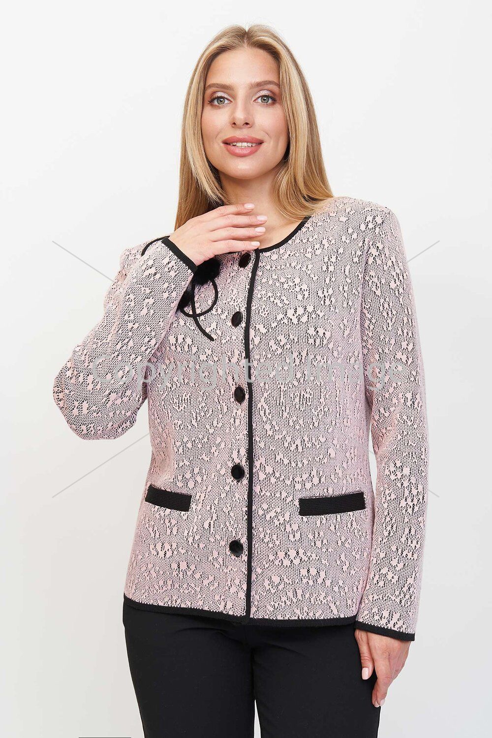 Women's jacket semi-fitted silhouette with a round neck. The jacket is buttoned with contrasting color buttons. Long set-in sleeves. Two welt pockets. The knitted jacket is made of jacquard weave. The neck, the bottom of the sleeves, the bottom of the product and the entrance to the pockets are made in a contrasting color. On the top of the product there is a pattern with a knitted lace and fur.