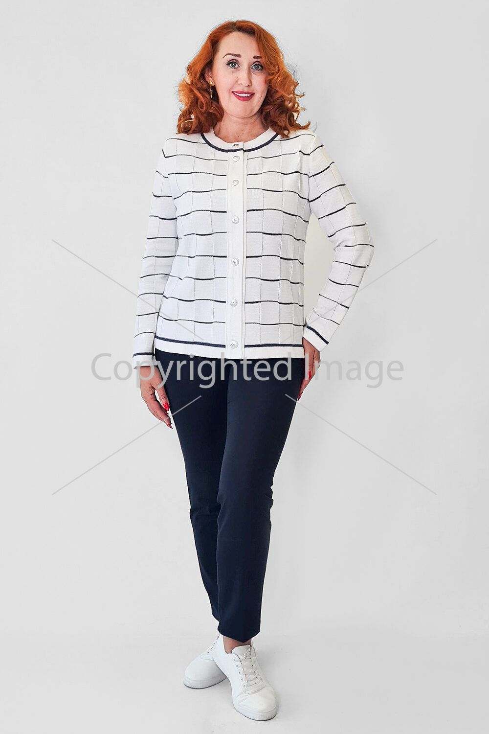 Elegant women's jacket made of knitted fabric of a semi-fitting silhouette with a round neck, buttons. Long set-in sleeves. The jacket is made of interlacing, forming a checkerboard pattern. Contrasting effect trim and metal buttons.