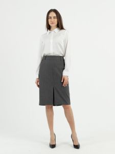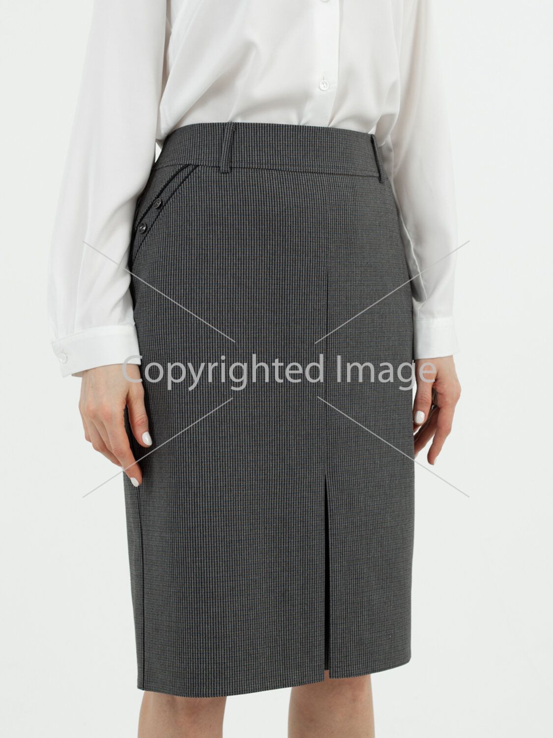Women's skirt of a straight silhouette, lined, with a fitted belt. The clasp is located at the back of the middle seam on a hidden braid zipper. This model has a yoke on the front and back, decorative inserts decorated with buttons on the sides. Front center fan.