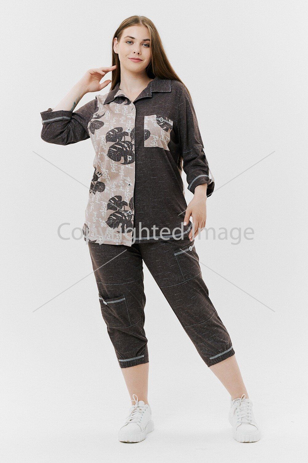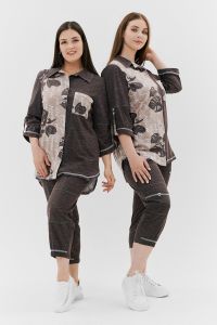 Women's tunic of a straight silhouette with a turn-down collar. Buttonhole closure. Set-in sleeve, 3/4 length with cuff and flap. The bottom of the tunic is shaped, the back is slightly longer than the shelf. There is a chest pocket on the shelf.