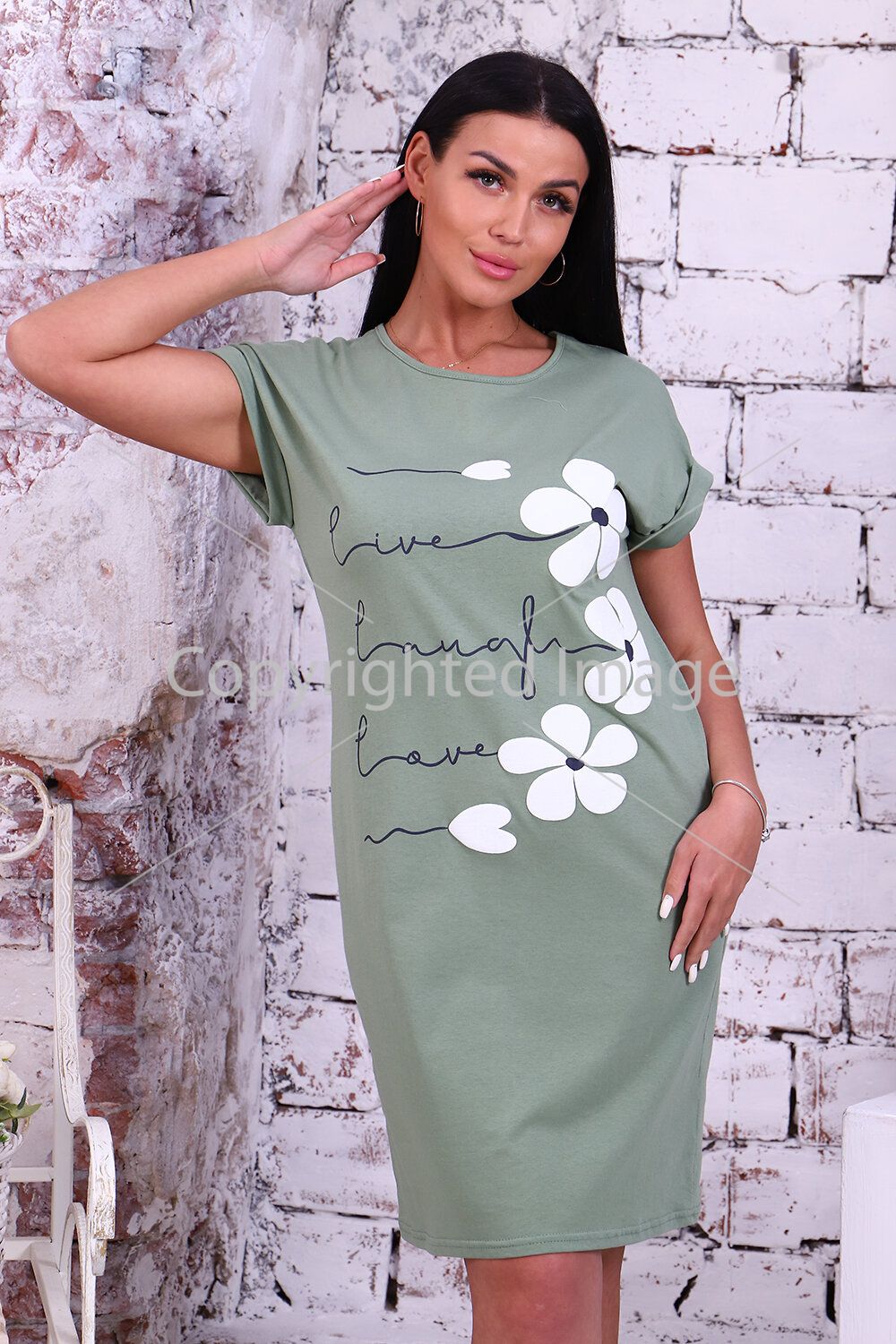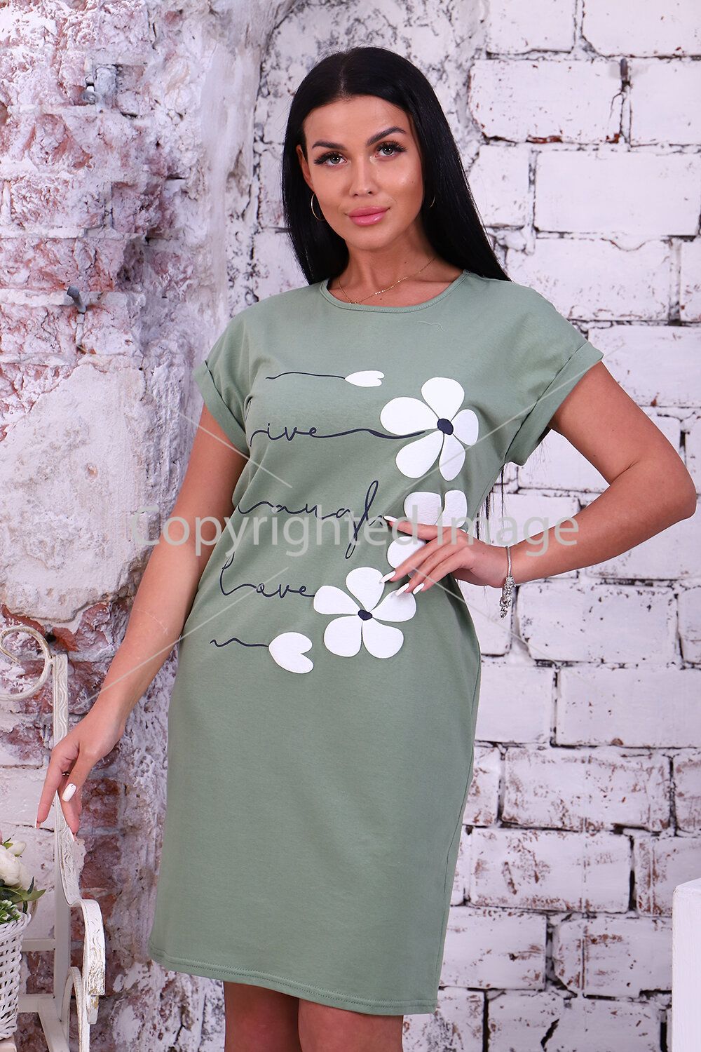 Women's tunic with a delicate 3D print of solid kulirka, the model has a slightly fitted silhouette, a rounded neck treated with a label, a lowered armhole on the cuff with a lapel. Casual, cozy, pleasant to the body tunic is an indispensable thing for home and walking.