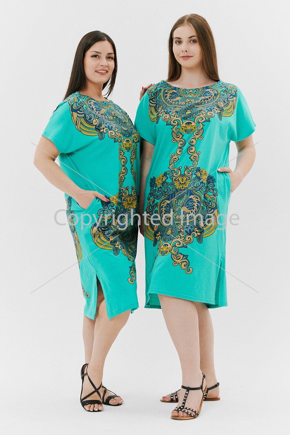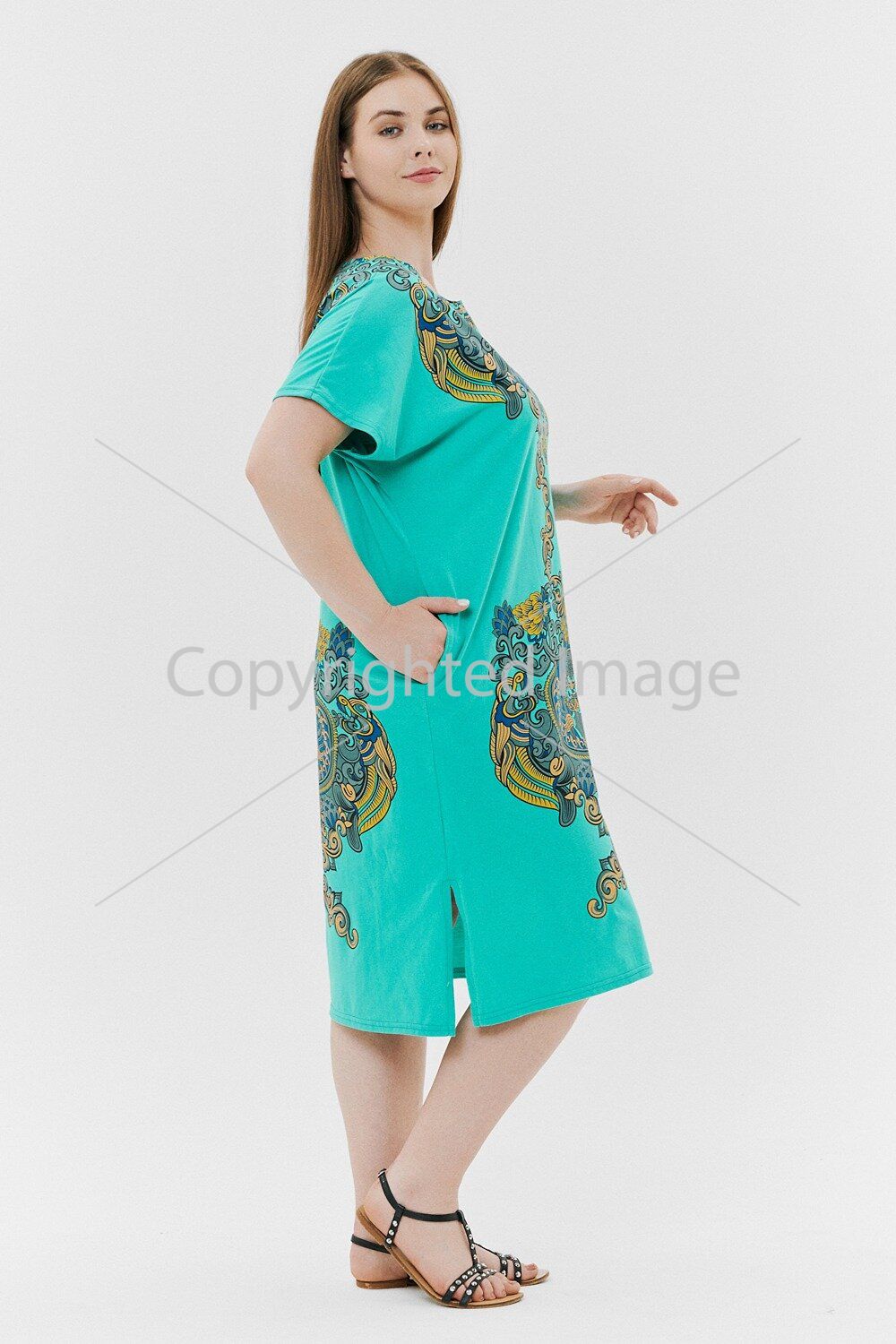 Women's tunic of a straight silhouette, one-piece short sleeve, internal pockets in the side seams, slits at the bottom. There is a print on the shelf and back.