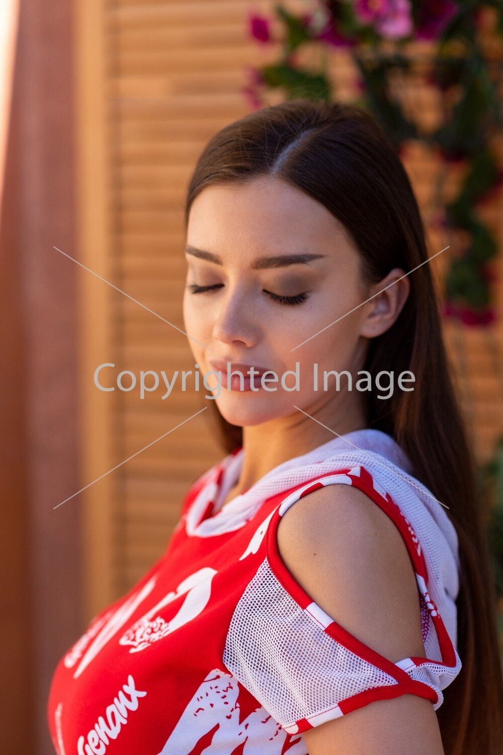 Tunic of a semi-fitting silhouette, above the knee in front and elongated back, with a mesh hood, with pockets in the back side seam. The sleeve is short, made of mesh, with a curved neckline. Incisions were made in the lower part of the side seams. The front edge of the hood, the shaped cutouts and the bottom of the sleeves are processed with a label from the main fabric.