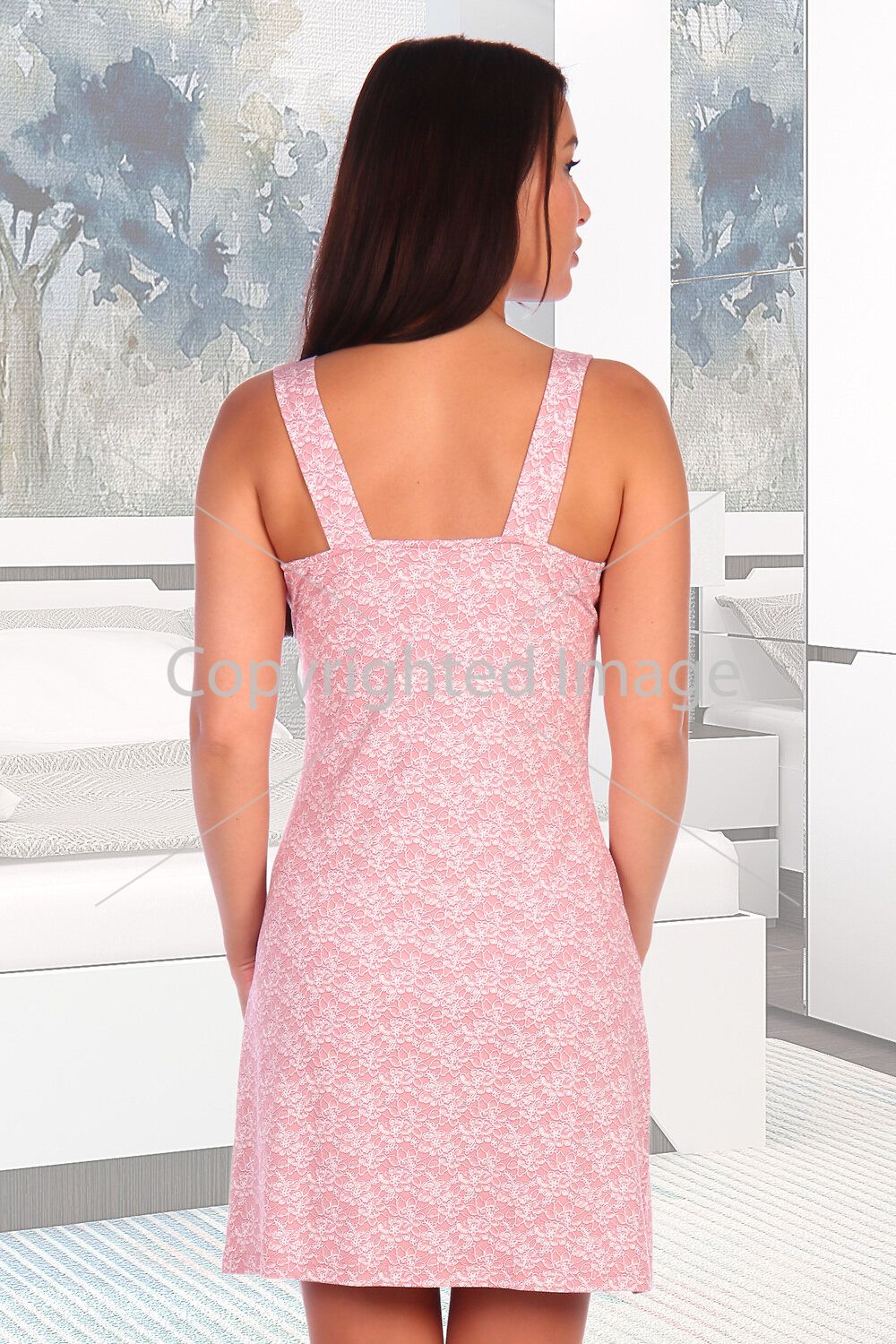Viscose chemise with lace inserts on the bodice, total length to mid-thigh.