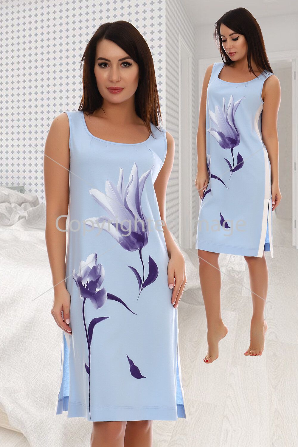 Light chemise with straps, one-piece back. Length just above the knees. Print-flowers