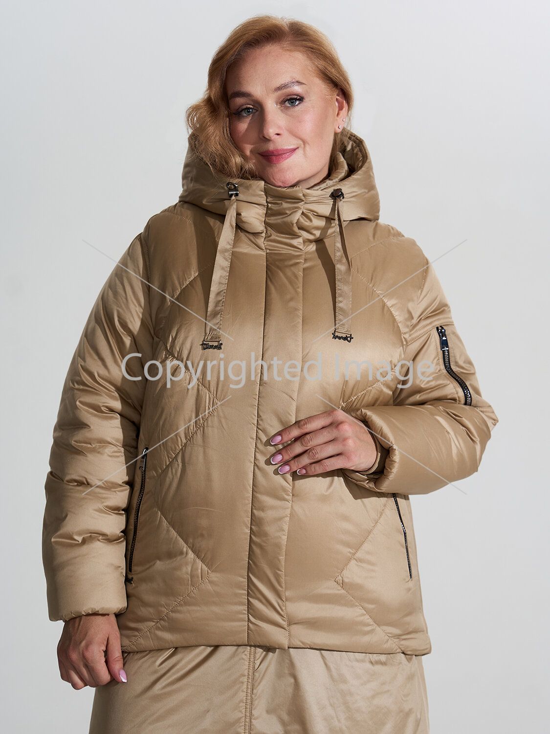 Cropped warm winter jacket from the Russian manufacturer D'imma Fashion Studio. Perfectly adjusted design with a slightly elongated back, drawstring at the bottom. Tractor two-way zipper closure. Pockets on the shelf and an additional pocket on the sleeve are also zipped. The hood is not detachable and is complemented by a stand-up collar for thermal protection. Sleeves with internal knitted cuffs. Elastic assembly on the shelf contributes to a perfect fit on any figure. The jacket is made of fabric with a water-repellent impregnation, which will greatly help in rainy and windy weather. Thanks to the latest TherMmax insulation, the product will be very warm and light. Its strengths are as follows: high heat and air conductivity, low specific gravity, good elasticity, hygiene, elasticity, strength, durability, shape stability, easy washing and fast drying. This model of jacket is combined with the insulated skirt "Vilma", made of the same fabric. The printed lining perfectly lets in air and moisture. Inside pocket. Wide size range, available in large sizes.